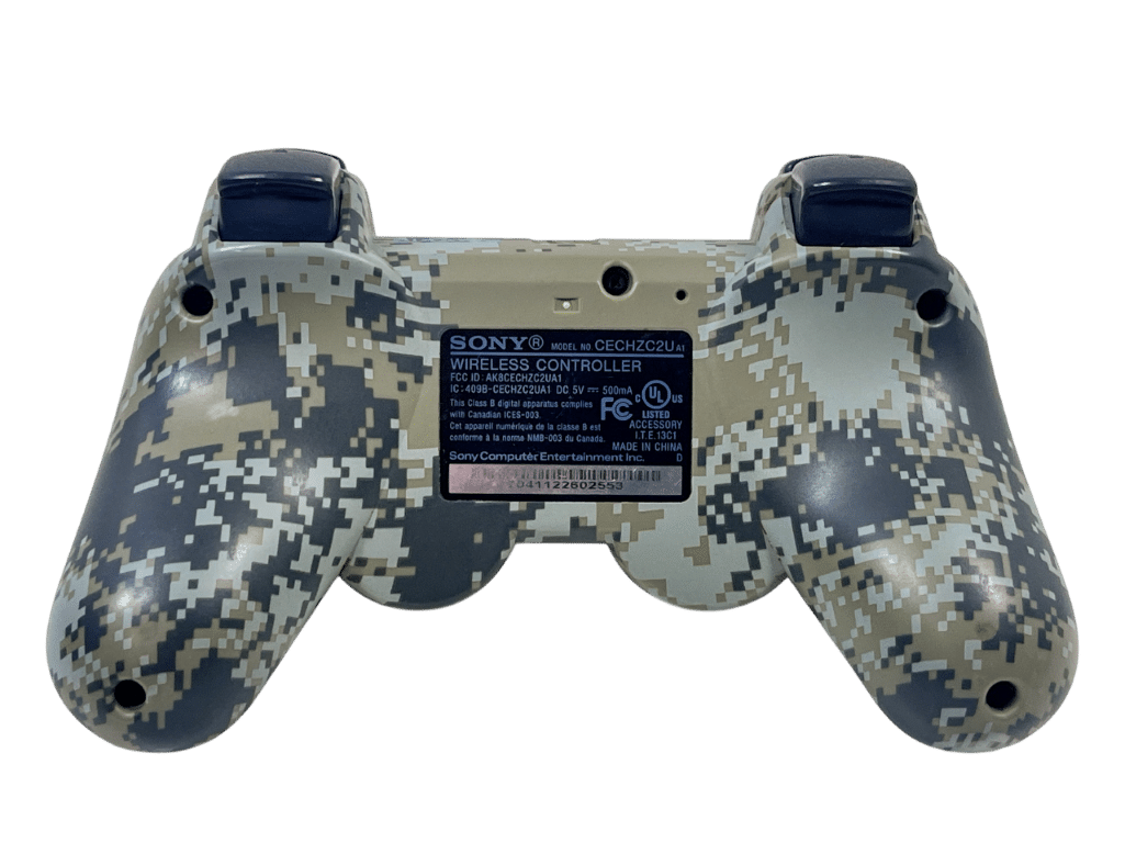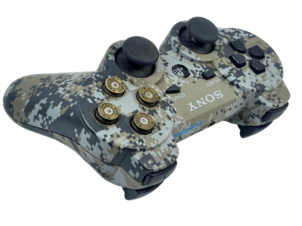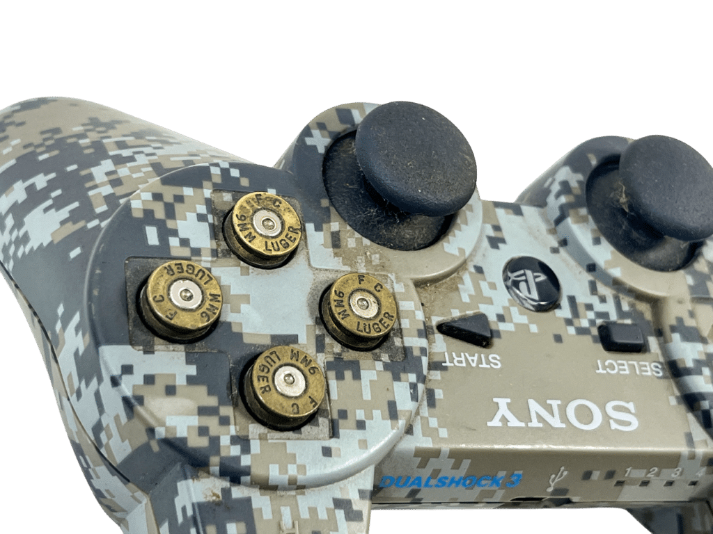 We are a game store which receives hundreds of preowned games and gaming items traded in weekly. But none as obscure (and rare) as this PS3 controller, which features GENUINE Luger 9mm FIREARM AMMUNITION CARTRIDGE HEADS for buttons! An expert was at play here, because these buttons feel as tight and responsive as the original buttons, possibly even more so. This preowned controller is in excellent condition and perfect working order, and is certainly a sight to behold and a worthy collector’s item. A genuine Limited Edition SONY PlayStation 3 Controller: DIGITAL CAMOUFLAGE. This preowned controller is in Excellent Condition and perfect working order. Refer photographs and add this to your collection today.