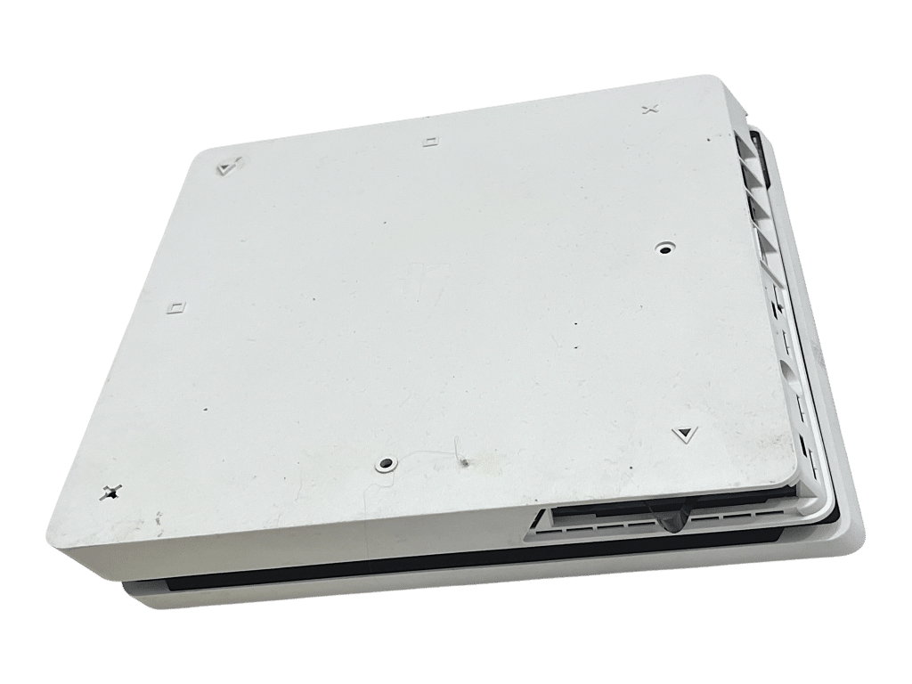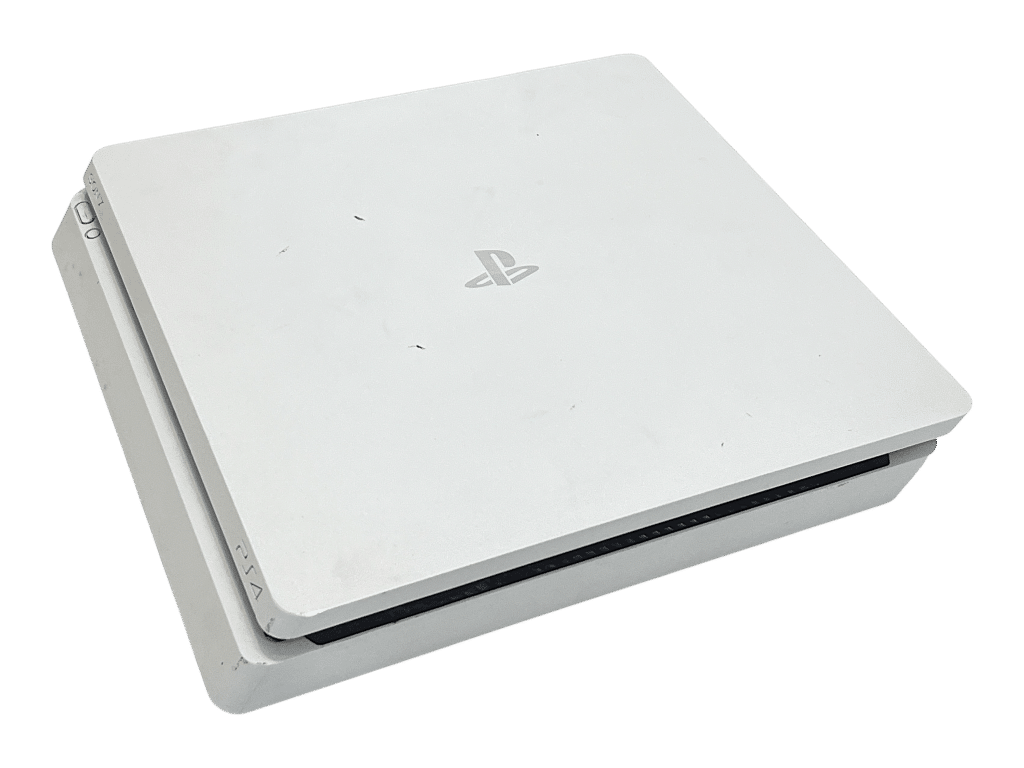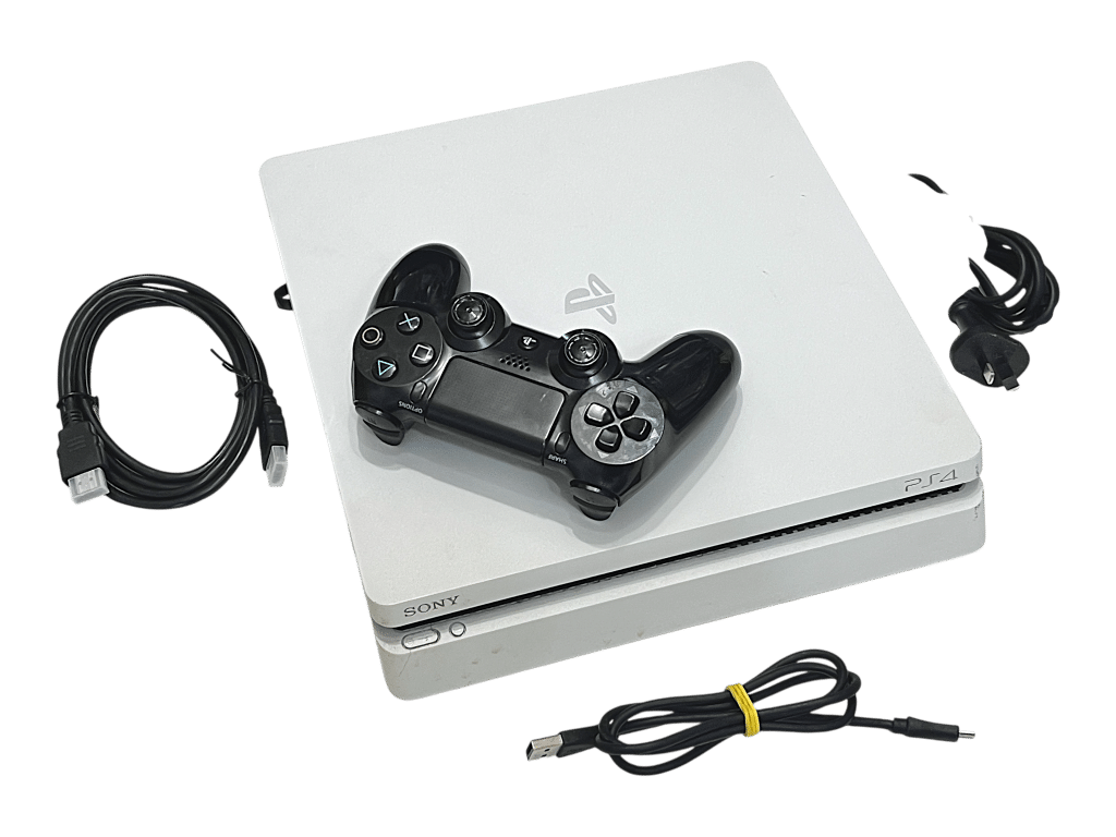 Preowned SONY PS4 Slim 500GB Console – White – in perfect working order, with Genuine SONY PS4 Controller. This preowned genuine White PS4 Slim includes matching Genuine SONY DualShock 4 Wireless PS4 Controller HDMI Lead, Power Lead, and USB Charging Lead to charge controller. Everything in perfect working order. Console has visible surface markings and the small plastic side has come off which makes the Hard drive ribbon visible, but this does not affect its functionality in any way. Controller rubber analogs worn as pictured, but again, a cosmetic imperfection only which does not affect its performance or functionality in any way. The console is quick on wifi and game recognition.