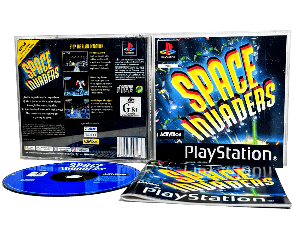 Excellent Condition & 100% Complete with Contents: SPACE INVADERS for SONY PlayStation 1 / PS1. This preowned game is in superb condition and comes complete with case + front cover slip + rear cover slip + manual / booklet + game disc. Still with original price stickers on front of case. Add this to your collection today.