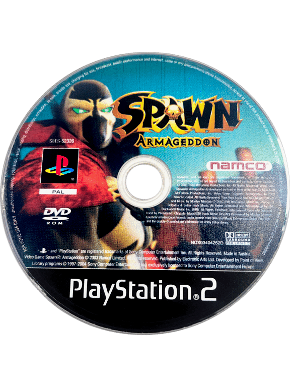 Spawn Armageddon (PS2). This preowned SONY PlayStation 2 game disc (PS21 game disc) is in good condition with only faint markings and superficial scratches which do not affect gameplay in the slightest (game includes 30 DAY WARRANTY). Disc comes inside an empty blank case. Please note that the original case is NOT included.