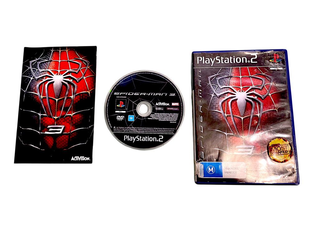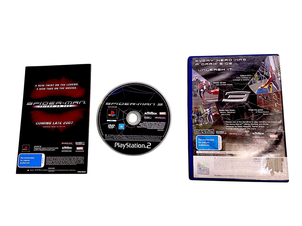 Spider-Man 3 (PS2). This pre-owned game is in good condition with mild disc surface imperfections only which do not hinder gameplay or performance in any way. This game includes the pictured case and contents. Refer to the photographs.