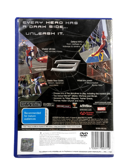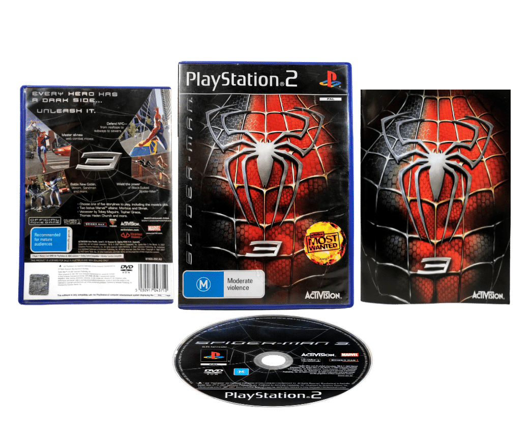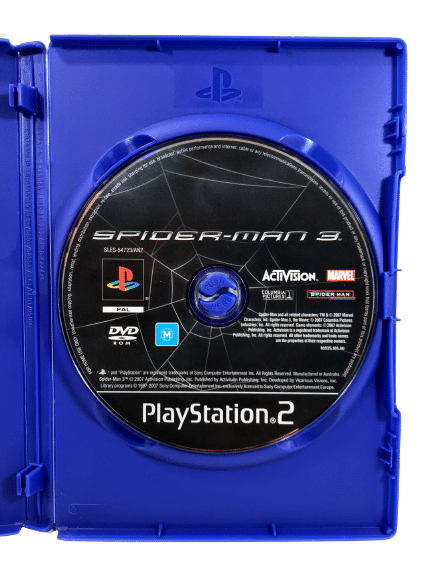Marvel’s SPIDER-MAN 3 / Spider Man 3 / SpiderMan 3 for SONY PlayStation 2 / PS2. This preowned game includes case + cover + game disc. Some light superficial markings / cosmetic scratches, but these are very minor imperfections which do not affect game play in any way. Please note that the manual is not included in this listing, but the game is self-explanatory, and the instructions are readily available online.