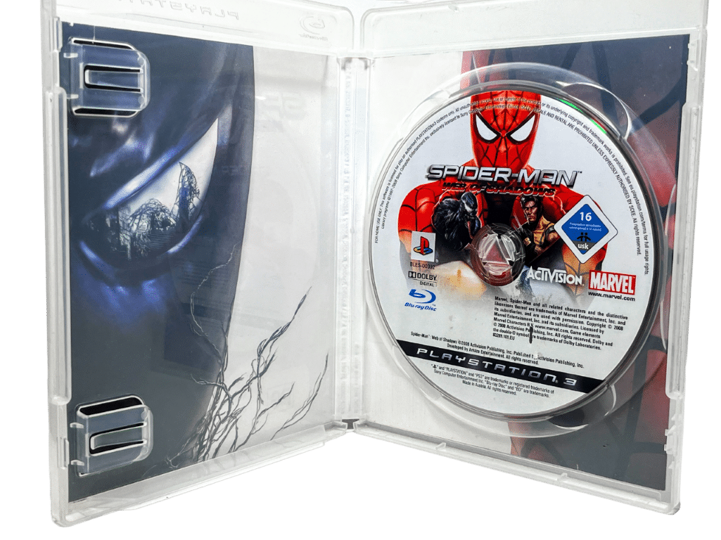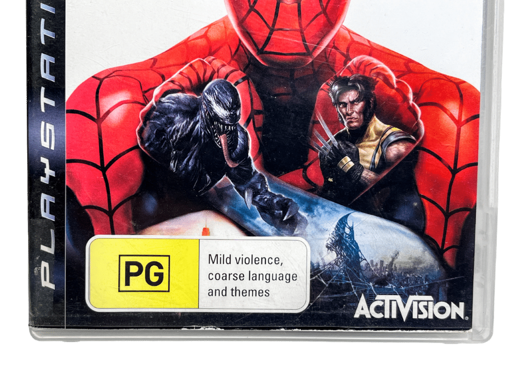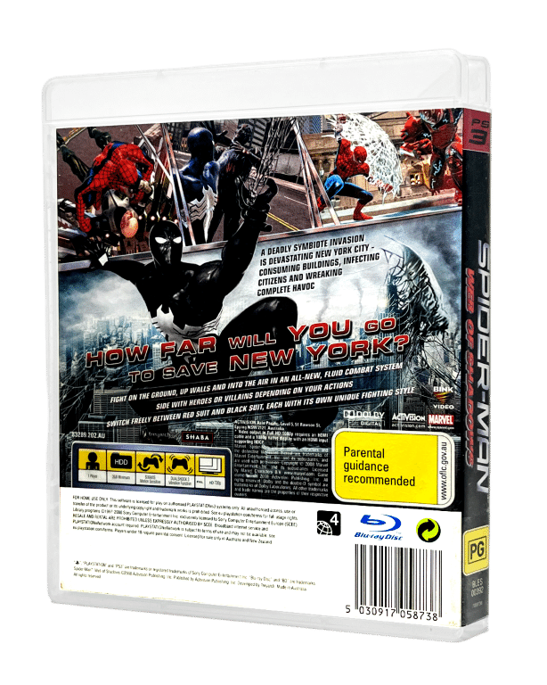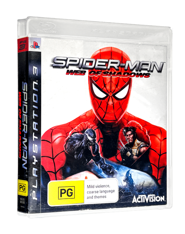 RARE & collectible PS3 Marvel game – GENUINE NZ EDITION: Spider-Man Web of Shadows / SpiderMan Web of Shadows / Spider Man Web of Shadows for SONY PlayStation 3 / PS3. This preowned game is in excellent condition and includes case + Genuine New Zealand cover (with the signature PG Classification embedded in the cover art) + game disc. Manual not included. Paper cover has a very fine line of paper fraying along the bottom edge and tiny patch of discolouration at the very bottom of the spine from where an old price sticker has been removed, but this is an extremely minor imperfection. A game that is rising in value through time.