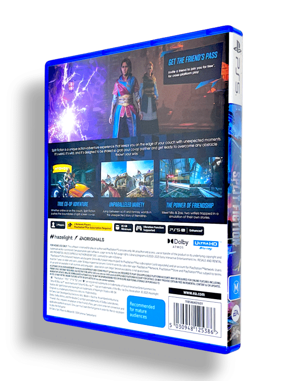 Embrace mind-blowing moments as you’re pulled deep into the many worlds of Split Fiction, a boundary-pushing co-op action adventure from the studio behind 2021 Game of the Year Winner It Takes Two. Mio and Zoe are contrasting writers – one writes sci-fi and the other writes fantasy – who become trapped in their own stories after being hooked up to a machine designed to steal their creative ideas. They’ll have to rely on each other to break free with their memories in-tact, working together to master a variety of abilities and overcome diverse challenges while jumping between sci-fi and fantasy worlds in this unexpected tale of friendship.