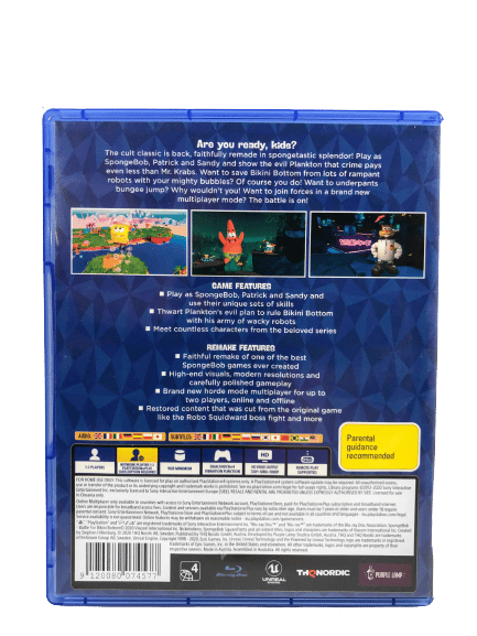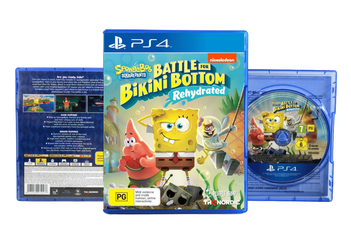 SpongeBob SquarePants: Battle for Bikini Bottom – Rehydrated (PS4) is a faithful remake of the beloved 2003 platforming classic, rebuilt with enhanced visuals, improved controls, and new features. Developed by Purple Lamp Studios and published by THQ Nordic in 2020, the game brings Bikini Bottom to life in vibrant HD, with characters and environments reimagined in a modern cartoon style.