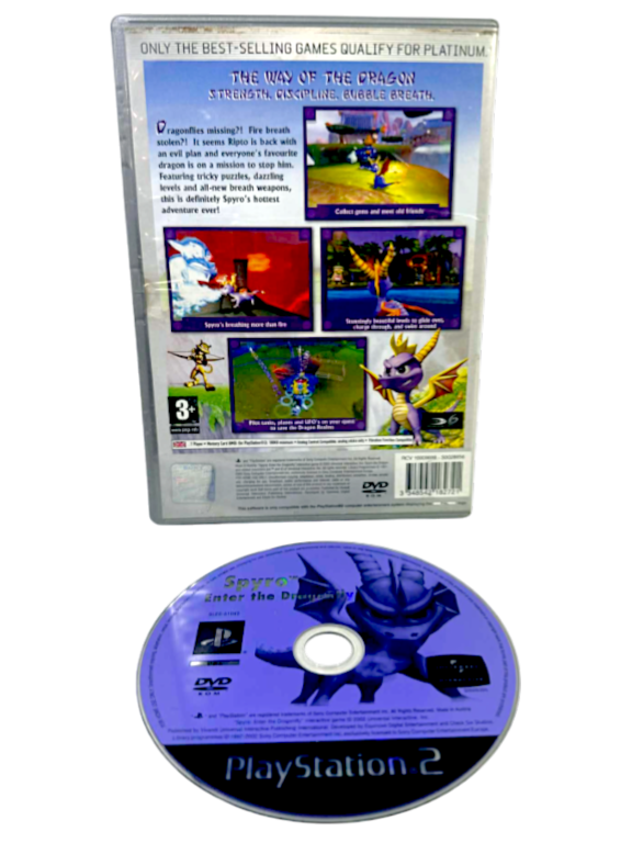 DESCRIPTION: Spyro: Enter the Dragonfly continues the colourful adventures of the beloved purple dragon in a new generation of 3D platforming worlds. Players explore vibrant environments while collecting gems, rescuing dragonflies and defeating enemies using Spyro’s fire breath and special abilities. Each level features hidden areas, puzzles and challenges that reward exploration and careful platforming. The game introduces new dragonfly companions that grant unique powers such as electric breath and bubble attacks. With its charming characters and whimsical fantasy world, Spyro remains one of the most recognisable platforming franchises from the PlayStation era.