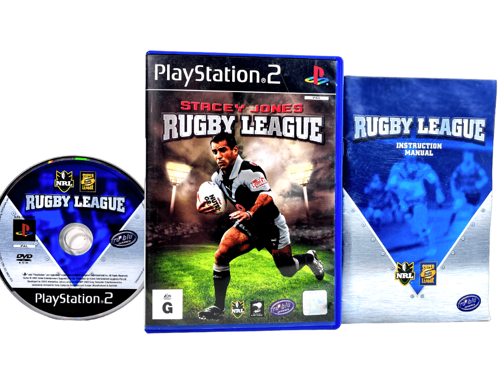 Good condition & 100% complete with contents: STACEY JONES RUGBY LEAGUE – OFFICIAL NEW ZEALAND EDITION – for SONY PlayStation 2 / PS2. This preowned game is in good condition and comes complete with case + cover + manual / booklet + game disc.