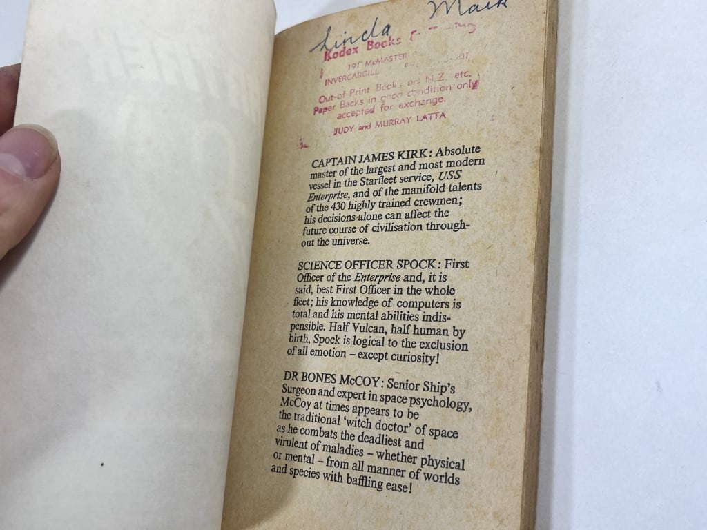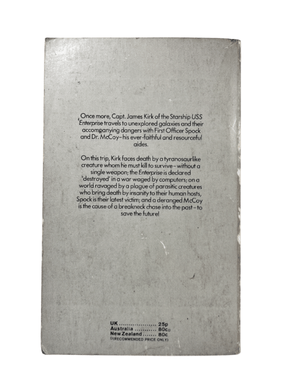 STAR TREK 2 second novisation of original Star Trek TV episodes. And a good ‘un too! This edition 1972 by Corgi. An early print in fair preowned condition. A name and book store stamp inside front cover on the very first page. Aside from this, appears to be unmarked.
