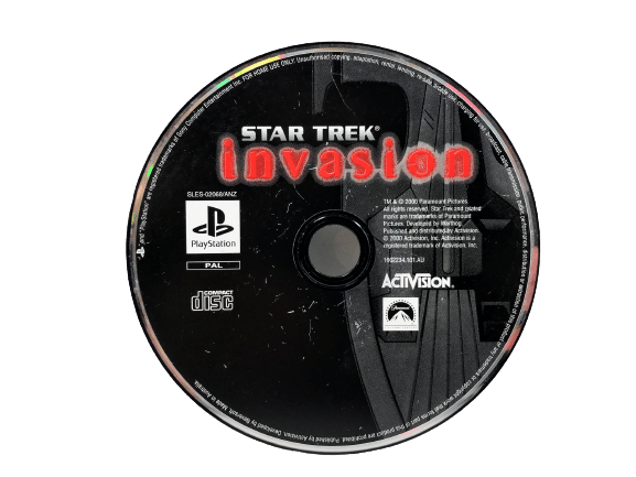 The Original Print disc: Star Trek Invasion for SONY PlayStation / PS1. This preowned game is the game disc only – case NOT included, but disc will be packaged and posted securely (or can be collected from our Appleby Games Christchurch store). Disc in good playing condition, with only fine superficial scratches which do not affect game play in any way.