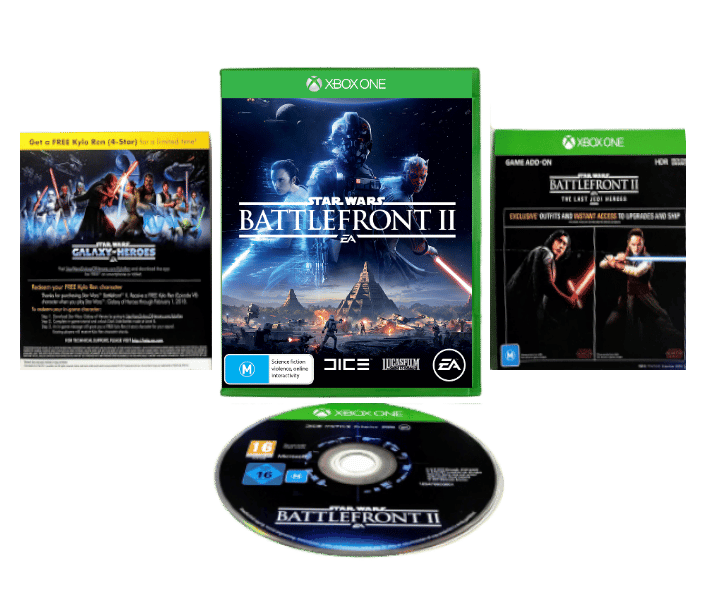STAR WARS Battlefront 2 (Battlefront II) for XBox One. This preowned game is in excellent condition and comes complete with case, cover, and game disc. Advertising papers not included, but these are promotional only and not required for game play or completion.