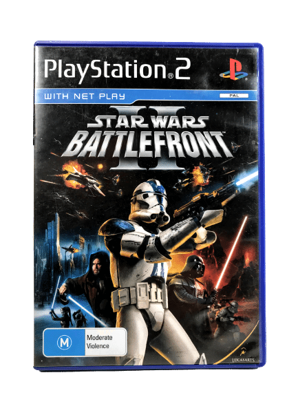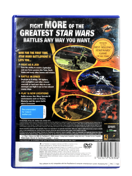 AUTHENTIC NEW ZEALAND PRINT: Star Wars Battlefront 2 for SONY PlayStation 2 / PS2. This preowned game is the genuine NZ / AUS Release with the signature “M” embedded in the cover art and on the game disc.