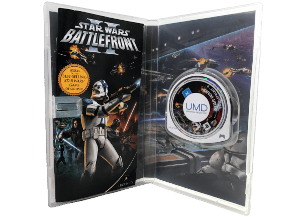 RARE PSP Game in Excellent Condition & 100% Complete with Manual: STAR WARS BATTLEFRONT 2 for SONY PSP / PlayStation Portable. This preowned game is in superb condition, and comes complete with case, cover, manual / booklet, and game disc inside its miniature UMD case. A tidy and complete collector’s item.