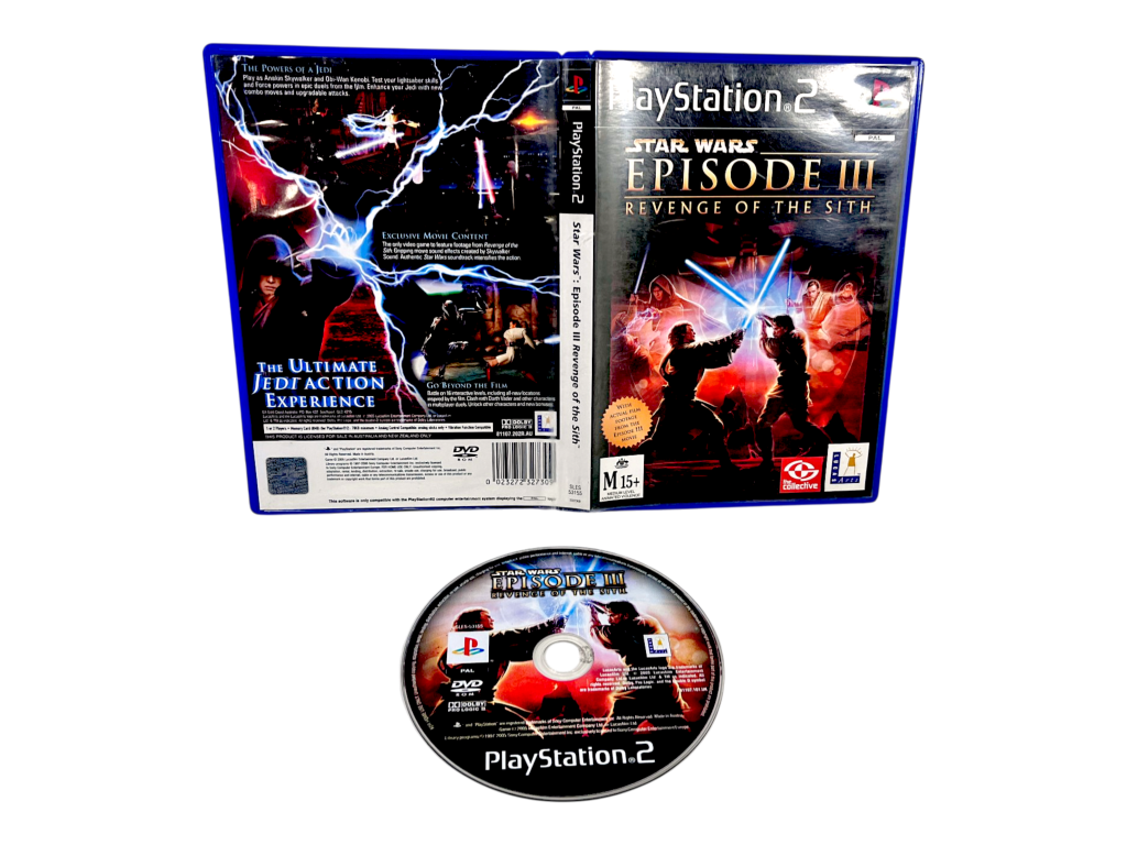 DESCRIPTION: This complete edition of Star Wars Episode III: Revenge of the Sith includes the case, disc, and artwork, offering a cinematic action experience based on the film. Players control Anakin Skywalker and Obi‑Wan Kenobi across 17 levels featuring lightsaber combat, Force abilities, and upgradeable attacks. The game includes exclusive movie footage, authentic sound effects, and dramatic cutscenes that expand on the film’s events. Multiplayer duels add replayability, while the story mode allows players to experience key battles from both perspectives. A strong collectible for Star Wars fans and PS2 action‑game enthusiasts.