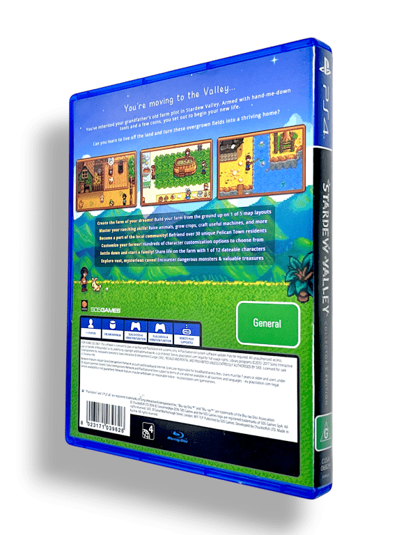 RARE PS4 PHYSICAL 2-DISC RELEASE in Mint condition & 100% complete with contents: STARDEW VALLEY COLLECTOR’S EDITION for SONY PlayStation 4 / PS4. This preowned game is in pristine condition and comes complete with case + cover + Collector’s SOUNDTRACK Disc + Collector’s Soundtrack Game Box (cardboard envelope / sleeve) + COLLECTOR’S POSTER + Game Disc. A very tidy and complete collector’s item, and a very rare collector’s bundle.