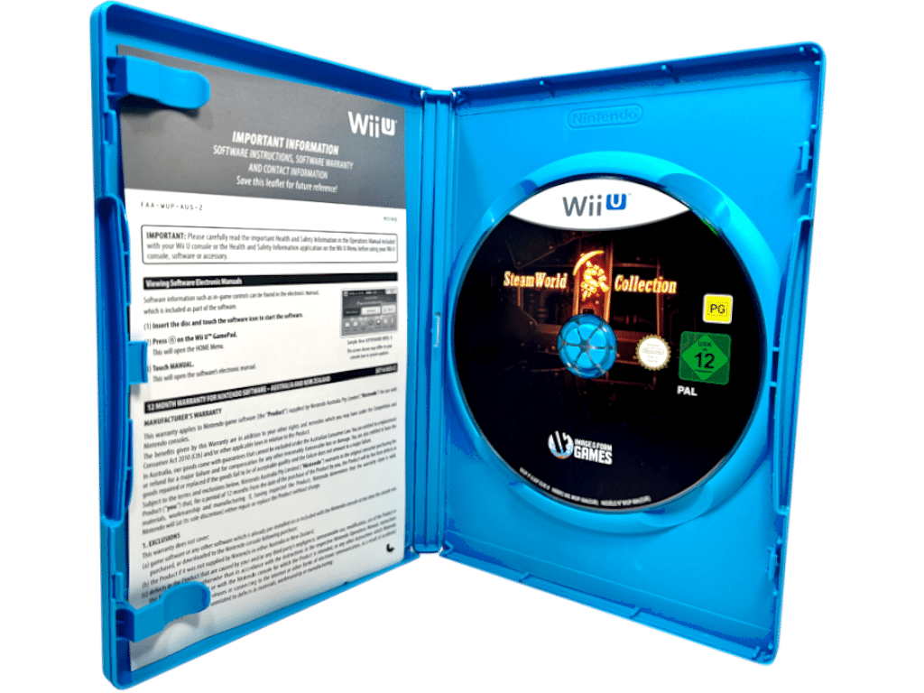 Genuine NZ Print in Excellent & 100% Complete with Contents: The Nintendo SteamWorld Collection for NINTENDO Wii U. This preowned game is in superb condition and is an authentic NZ/AUS Print Cover Edition, and complete with case + cover + Nintendo Wii U card + game disc.