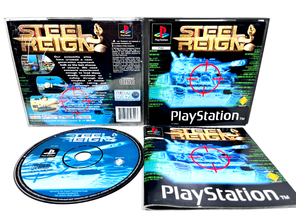 Rare & Collectible Original PlayStation (PS1) game in good condition & 100% complete with contents: STEEL REIGN for SONY PlayStation 1 / PS1. This preowned game is a Genuine Original Print “Black Label” Edition (non-Platinum) and comes complete with original case + covers (both front and reverse cover slips) + manual / booklet + game disc. Still with price sticker on front of case. Front cover + reverse cover + manual / booklet each in Excellent Condition. Front and back panels of case have plastic cracks, and the disc some very fine superficial scratches, but these are purely cosmetic imperfections which do not affect functionality or gameplay in any way.