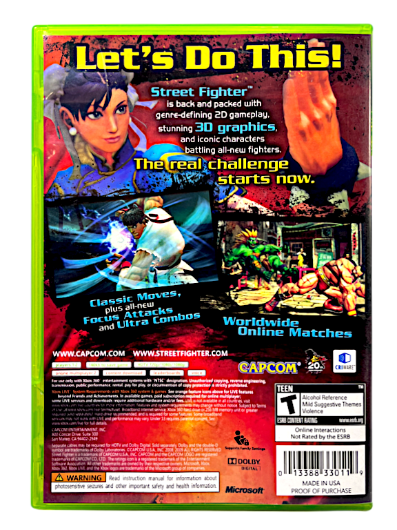 Alternate US Print in excellent condition & 100% complete with contents: STREET FIGHTER IV / Street Fighter 4 for XBox 360. This preowned game is in pristine condition and comes complete with case + cover + manual / booklet + game disc. The cover + manual + disc are each in Mint Condition. The case has a tiny plastic chip on one corner, but this is a purely cosmetic imperfection, and each of the internal contents are immaculate. Overall, a tidy and complete collector’s item.