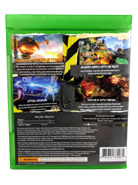 SUNSET OVERDRIVE for XBox One. This preowned game is in superb condition and includes case + cover + game disc. Promo cards not included.