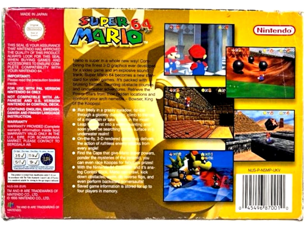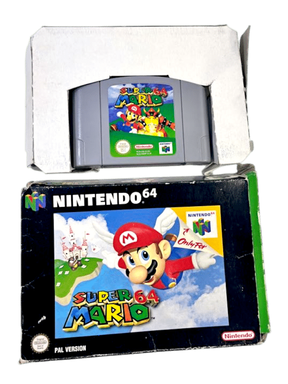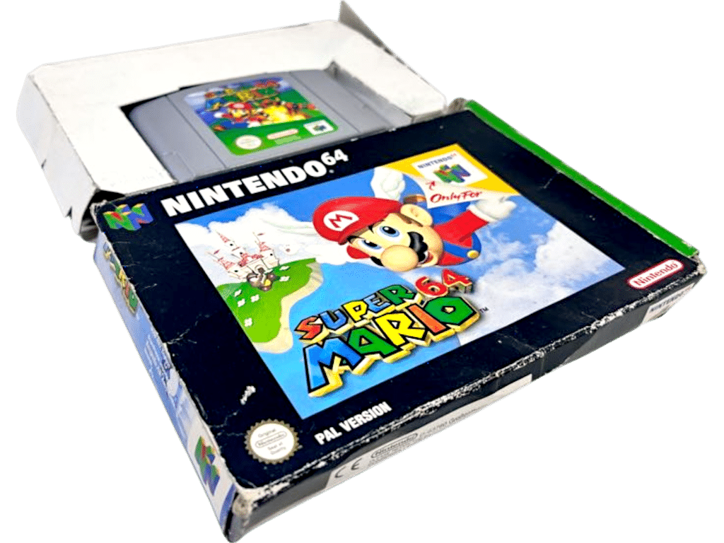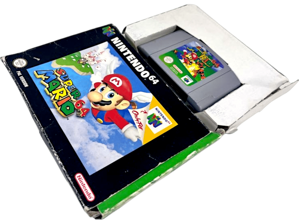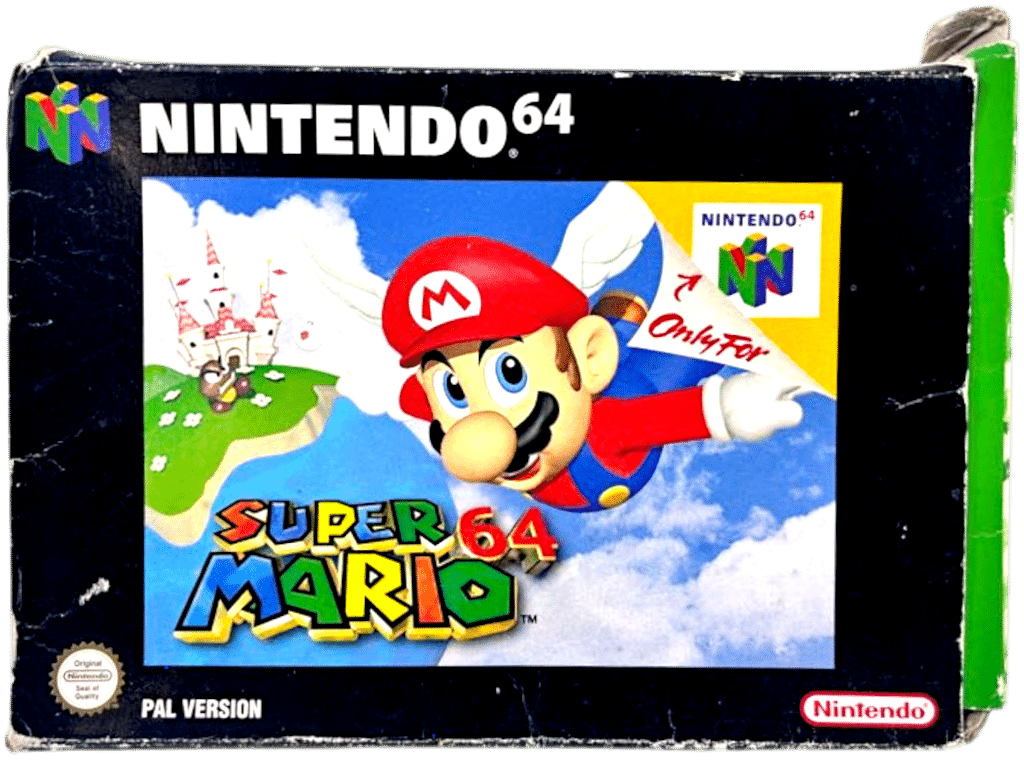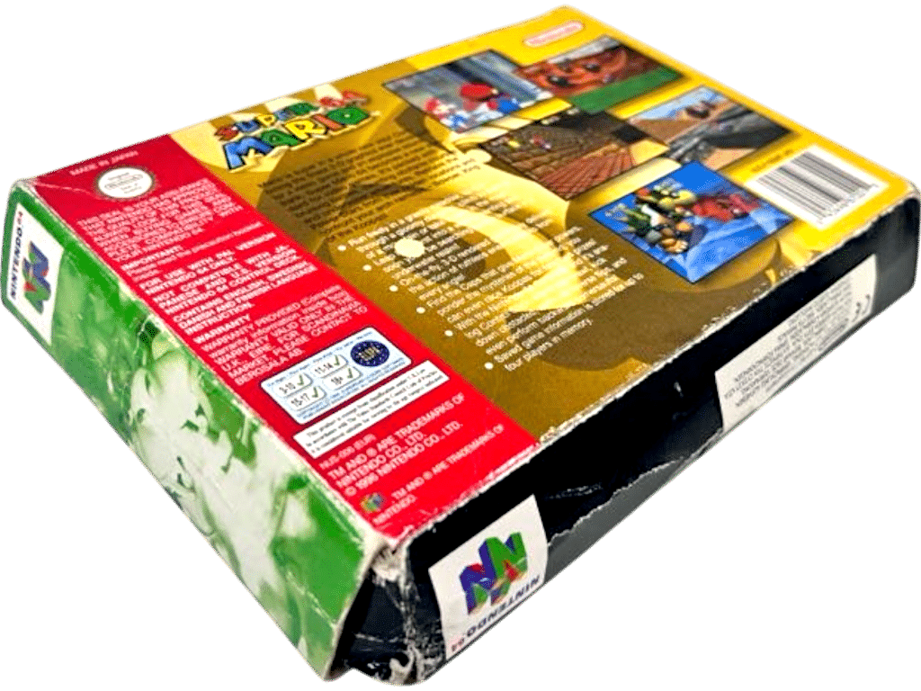 Super Mario 64 for Nintendo 64. This preowned game cartridge is in excellent condition and includes pictured box + inner cardboard game cartridge mount. Box has some pictured cardboard damage. Cartridge is very tidy.