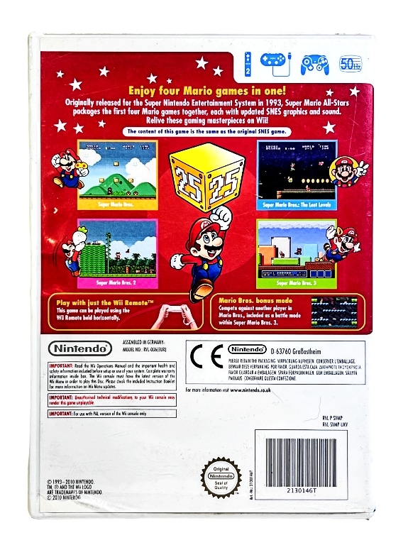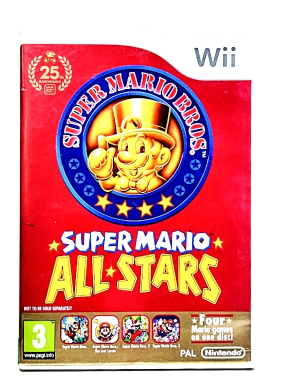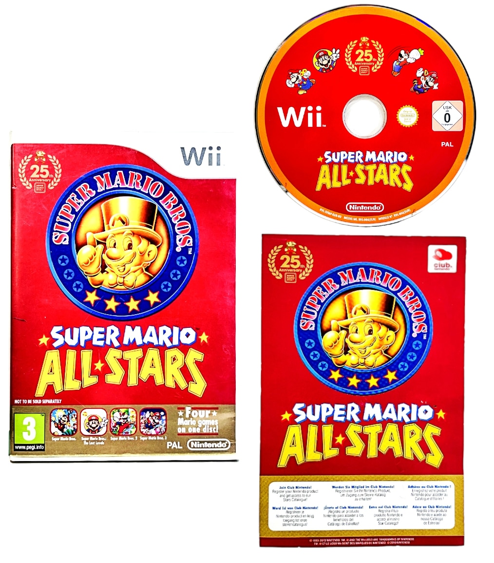 SUPER MARIO ALL STARS 25th ANNIVERSARY EDITION / Super Mario AllStars 25th Anniversary Edition for Nintendo Wii. This preowned authentic Limited Collector’s Edition is in good condition and includes case + cover + carded insert + game disc. Some light superficial markings / cosmetic scratches, but these are very minor imperfections which do not affect game play in any way. Refer photographs for included contents.