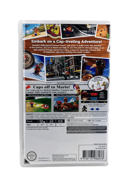 Join Mario on a massive, globe-trotting 3D adventure and use his incredible new abilities to collect Moons so you can power up your airship, the Odyssey, and rescue Princess Peach from Bowser’s wedding plans! This sandbox-style 3D Mario adventure – the first since 1996’s beloved Super Mario 64 and 2002’s Nintendo GameCube classic Super Mario Sunshine – is packed with secrets and surprises, and with Mario’s new moves like cap throw, cap jump, and capture, you’ll have fun and exciting gameplay experiences unlike anything you’ve enjoyed in a Mario game before.