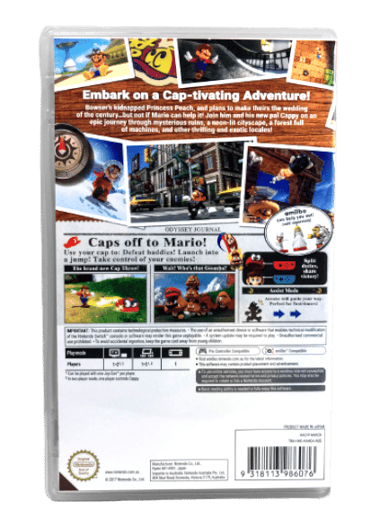 Join Mario on a massive, globe-trotting 3D adventure and use his incredible new abilities to collect Moons so you can power up your airship, the Odyssey, and rescue Princess Peach from Bowser’s wedding plans! This sandbox-style 3D Mario adventure – the first since 1996’s beloved Super Mario 64 and 2002’s Nintendo GameCube classic Super Mario Sunshine – is packed with secrets and surprises, and with Mario’s new moves like cap throw, cap jump, and capture, you’ll have fun and exciting gameplay experiences unlike anything you’ve enjoyed in a Mario game before.