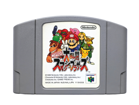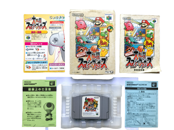 JAPANESE Nintendo 64 Cartridge in excellent condition and complete with box and inner contents: SUPER SMASH BROS for Nintendo 64. Preowned game. Inner contents – paperwork and game cartridge in very tidy condition. Box has expected card wear from storage, but still displaying well as pictured. Refer images.