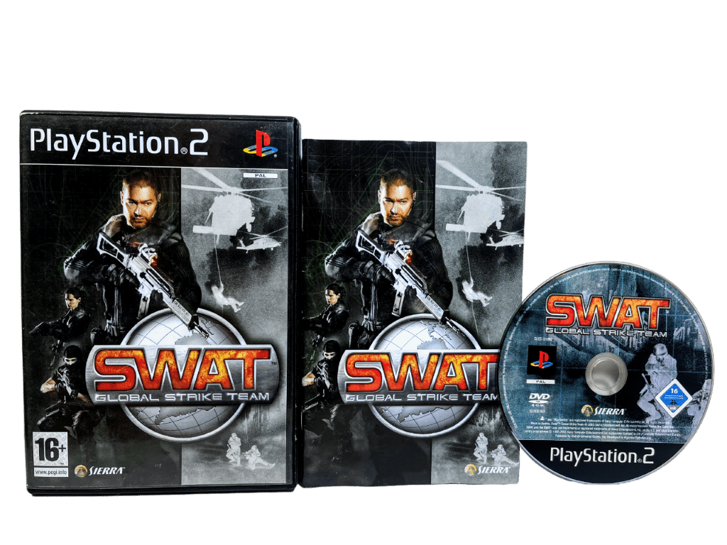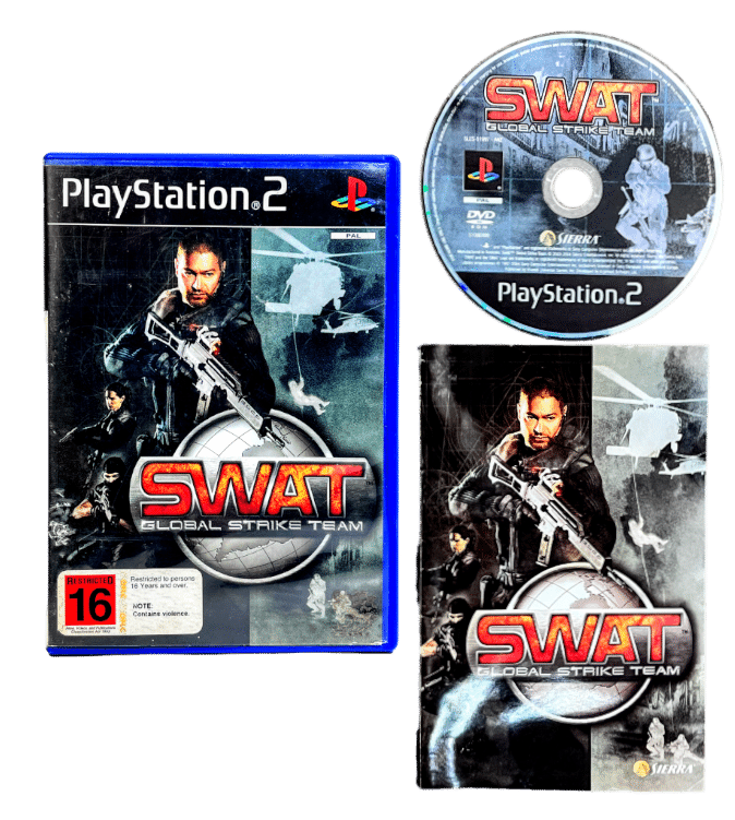 S.W.A.T. Global Strike Team for SONY PlayStation 2 / PS2. This preowned game includes original case and cover, each in excellent condition. The game disc is also included but has visible scratchings and will likely need resurfaced in order for it to be playable. The manual is not included here.