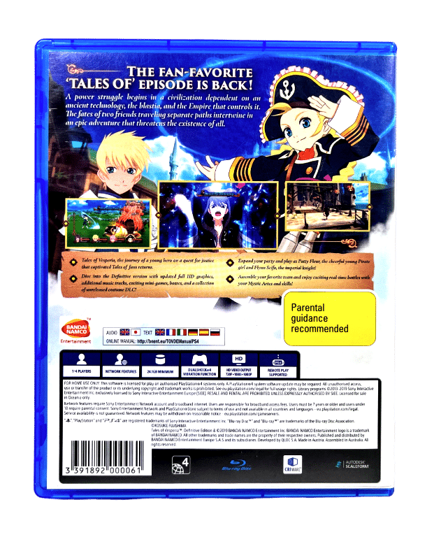 Excellent condition & 100% complete with contents: Tales of Vesperia Definitive Edition for SONY PlayStation 4 / PS4. This preowned game is in pristine condition and comes complete with case + cover + booklet + game disc.