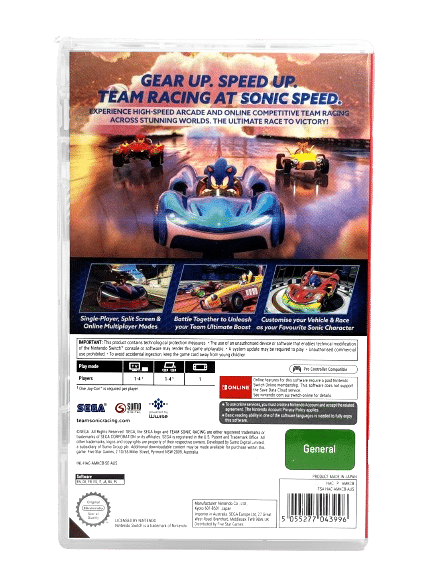 Team Sonic Racing combines the best elements of arcade and fast-paced style racing as you face-off with friends in intense multiplayer racing. Race together and work as a team by sharing power-ups and speed boosts. Take control of your racing style – Choose from 3 distinct character types and unlock game-changing vehicle customisation options to suit your racing style. Speed up. Gear up – Team Racing at Sonic Speed!