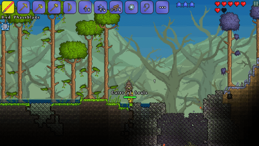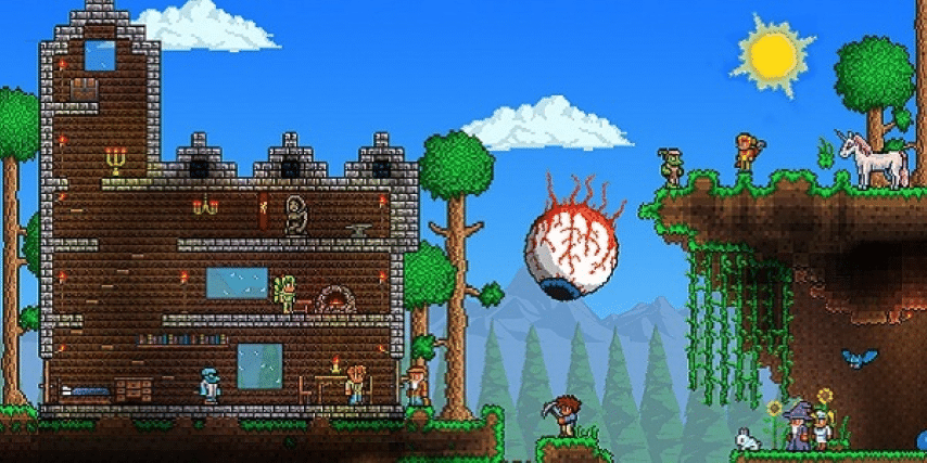 Grab your tools and go! You can do many things in Terraria: make weapons and fight off a variety of enemies in numerous biomes, dig deep underground to find accessories, money, and other useful things, gather wood, stone, ores, and other resources to create everything you need to make the world your own and defend it. Build a house, a fort, even a castle and people will move in to live there and perhaps even sell you different wares to assist you on your journey.