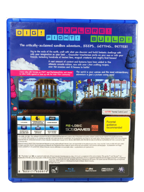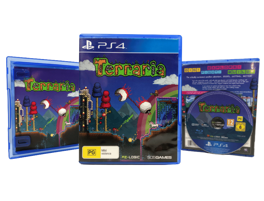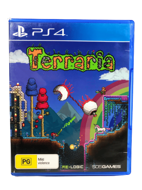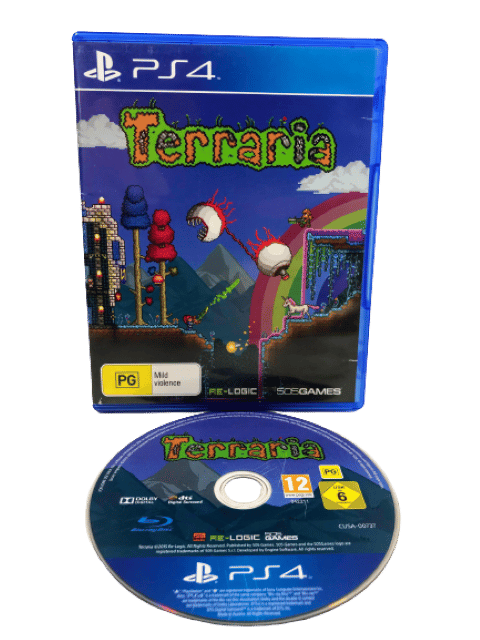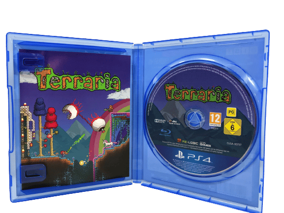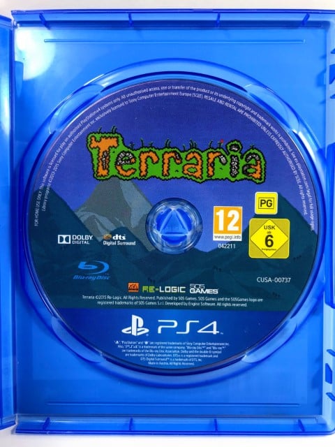 Excellent condition & 100% complete with contents: TERRARIA The Video Game for SONY PlayStation 4 / PS4. This preowned game is in superb condition and comes complete with case, cover, manual / booklet, and game disc. Genuine UK English print with the signature 12 classification embedded in the cover art, floating back in place of the PG. A lovely collector’s item.