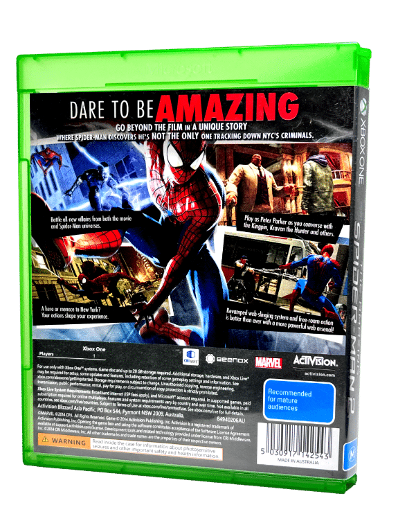 Rare & Collectible XBox One game in the Official NZ/AUS Release – in mint condition & 100% complete with contents: THE AMAZING SPIDER-MAN 2 / The Amazing SpiderMan 2 / The Amazing Spider Man 2. This preowned game is in pristine condition and comes complete with case + cover + game disc. A tidy and complete collector’s item.