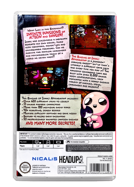 Rare Official NZ / AUS Edition: THE BINDING OF ISAAC AFTERBIRTH + for Nintendo Switch. This preowned game is in excellent condition, with original case, Genuine New Zealand cover (with the signature “M” Classification embedded in the cover art), and game cartridge. **BOOKLET NOT INCLUDED.