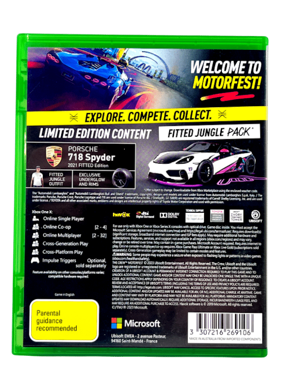 **NOTE that any single use paper vouchers may or may not still be valid. The Full Crew Motorfest Game is included on the game disc, and any bonus “Special Edition” downloadable content may have expired so should not be considered as included here.