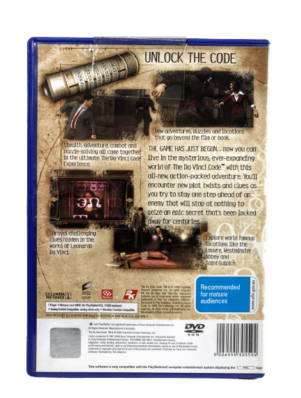Excellent condition & 100% complete with contents: The DA VINCI Code / The DaVinci Code for SONY PlayStation 2 / PS2. This preowned game is in superb condition and comes complete with case, cover, manual / booklet, and game disc. Game disc mint. Case is a BLACK DVD case so differs slightly to pictured case. All other contents are identical. A tidy and complete collector’s item.