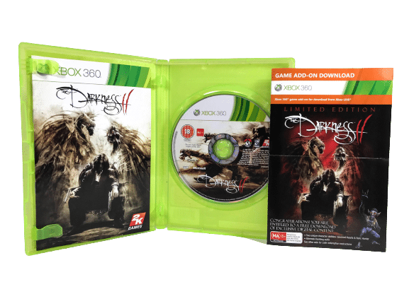 Excellent condition & complete with manual and LARGE COLLECTOR’S POSTER): The DARKNESS 2 LIMITED EDITION / The Darkness II Limited Edition for XBox 360. This preowned game is superb condition and includes case, cover, manual / booklet and game disc. Paper voucher not included, but this was a promotional download only and is not required for gameplay or completion.