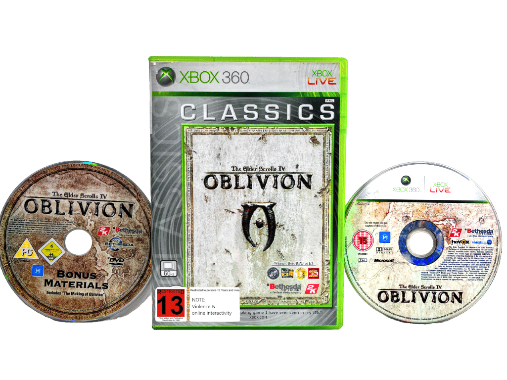 The Elder Scrolls IV Oblivion SPECIAL TWO DISC EDITION for XBox 360. This preowned game is in good condition and includes case + cover + game disc + special Bonus Material: “the Making of Oblivion” disc. Light markings on game disc, and an old price sticker remains on the front of the case, but these are purely cosmetic imperfections.
