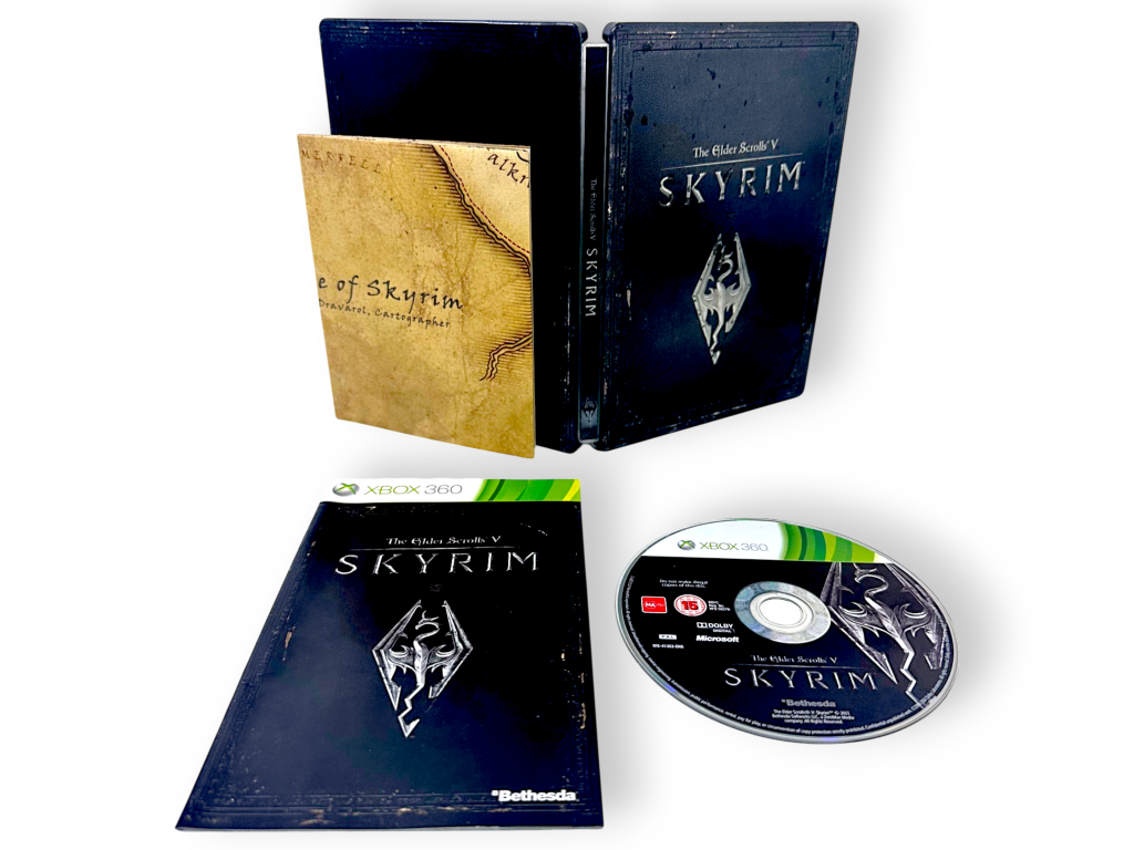 The Elder Scrolls V: Skyrim STEELBOOK EDITION (Xbox 360) . This preowned GENUINE LIMITED EDITION STEEL CASE COLLECTOR’S EDITION game is in good condition and includes pictured contents. Refer photographs.