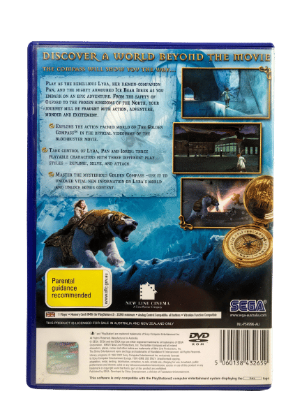 The GOLDEN COMPASS the video game for SONY PlayStation 2 / PS2. This preowned game includes case, cover, and game disc. The disc is in very tidy condition, with only faint superficial markings / cosmetic scratches, and these are extremely minor imperfections which do not affect game play in any way. The case has some light laminate wear on the front, but again, a very minor imperfection.