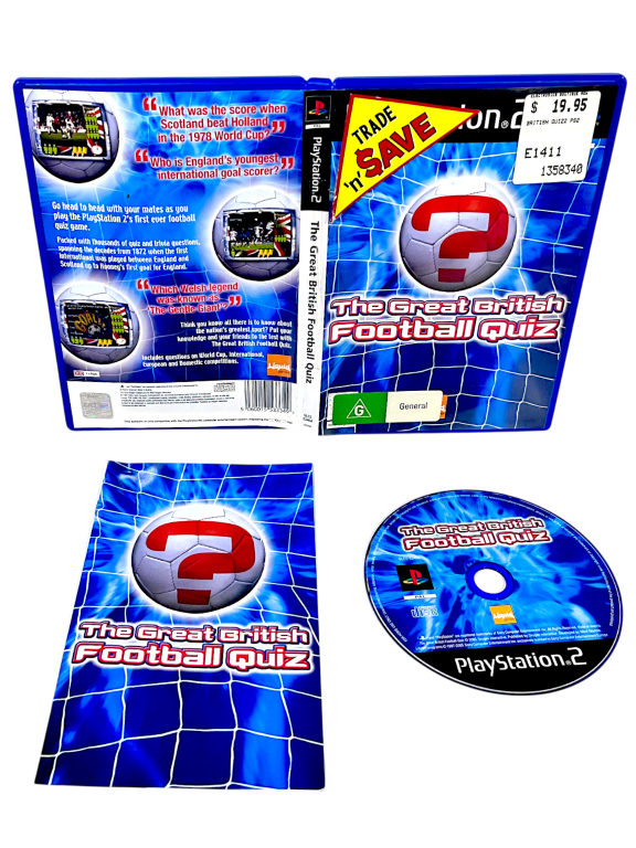 The Great British Football Quiz (PS2). This preowned game is in good condition and includes pictured contents. Very mild disc surface imperfections such as light scratches but these are purely cosmetic and do not hinder performance or gameplay in the slightest. Refer photographs for included contents.