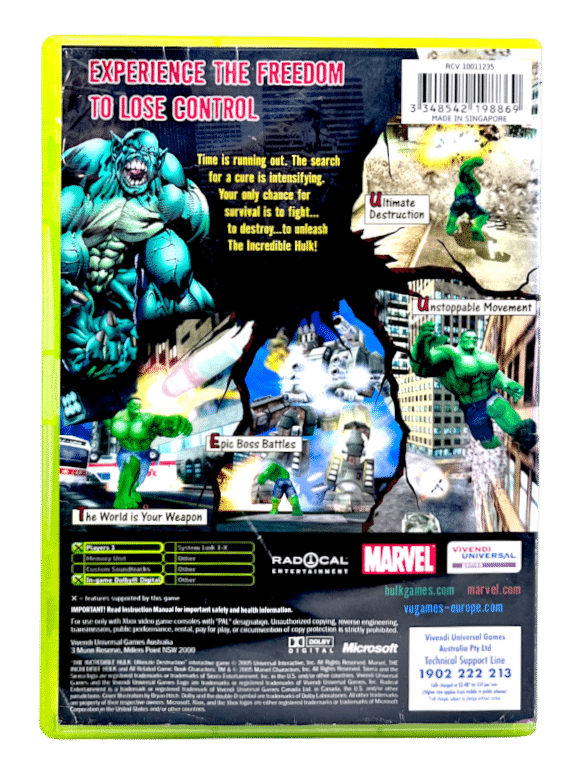The Incredible Hulk: Ultimate Destruction (PAL Edition) for Original Xbox. This preowned game includes case + cover + game disc. Some light superficial markings / cosmetic scratches, but these are very minor imperfections which do not affect game play in any way. Please note that the MANUAL IS NOT INCLUDED in this listing, but the game is self-explanatory, and the instructions are readily available online.