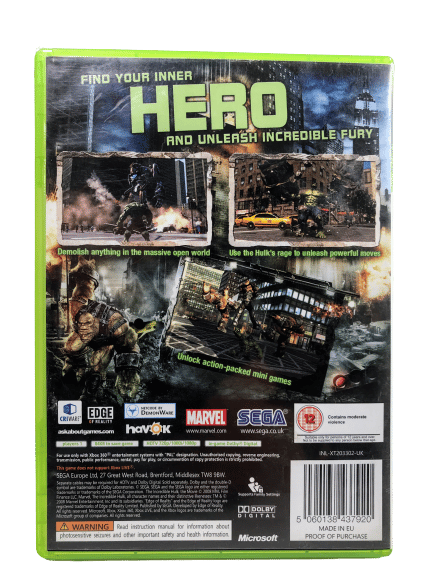 Rare Marvel game in excellent condition & 100% complete with contents: The Incredible Hulk for XBox 360. This preowned game is in very tidy condition and comes complete with case, cover, manual / booklet, and game disc. When I inspected the disc closely under reflective light I could just make out some faint superficial markings / cosmetic scratches, but these are extremely minor imperfections which do not affect game play in any way.