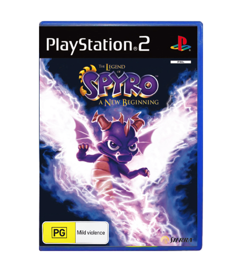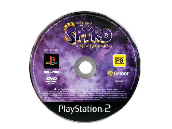 Excellent Condition & 100% complete with contents: The Legend of SPYRO A New Beginning for SONY PlayStation 2 / PS2. This preowned game comes complete with case, cover, manual / booklet, and game disc. Back of case has a tiny spot of laminate wear, and some faint markings on the disc, but these are extremely minor and purely cosmetic. Overall, a tidy and complete collector’s item, and a GENUINE NZ/AUS release with the signature “PG” classification embedded in the cover art and on the game disc.