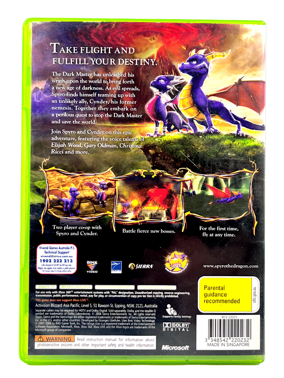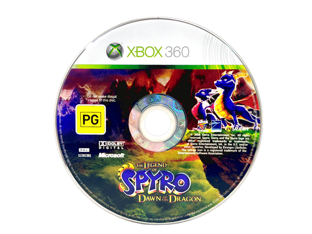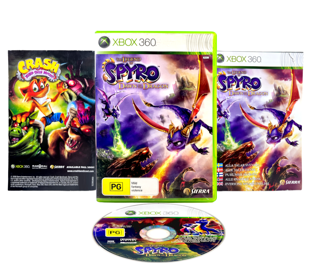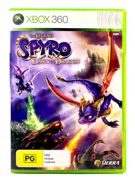 RARE XBOX 360 SPYRO GAME in mint condition & 100% complete with contents: The Legend of SPYRO Dawn of the Dragon for XBox 360. This preowned game is in pristine condition and is an authentic NZ/AUS print with the signature “PG” embedded in the cover art and on the game disc. This game is a very tidy and complete collector’s item, with case + cover + manual / booklet + game disc.