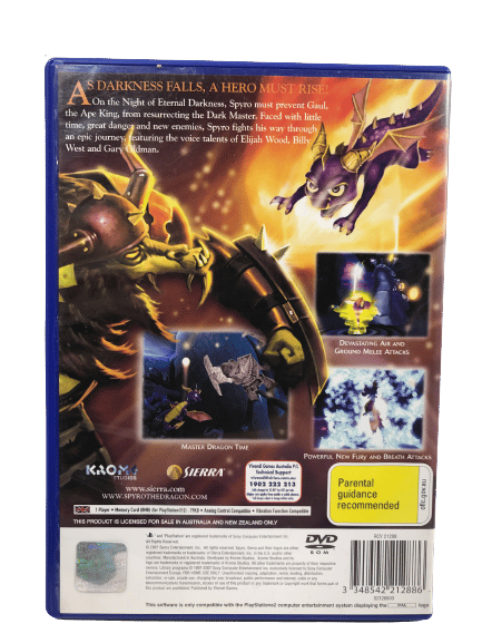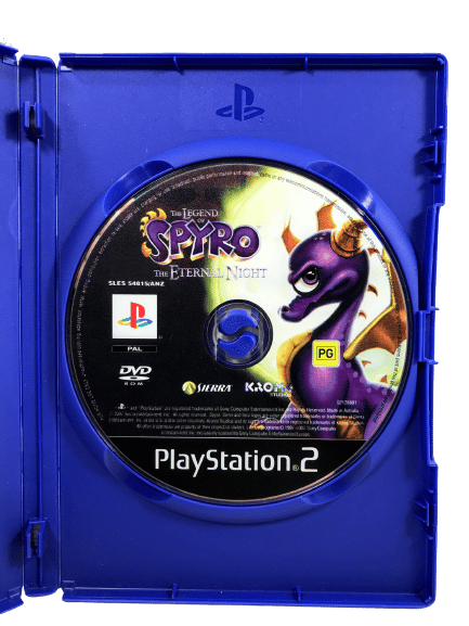 The Original Print in excellent condition: The Legend of SPYRO The Eternal Night for SONY PlayStation 2 / PS2. This preowned game disc is in mint condition and includes BLACK case + game cover + manual + game disc.