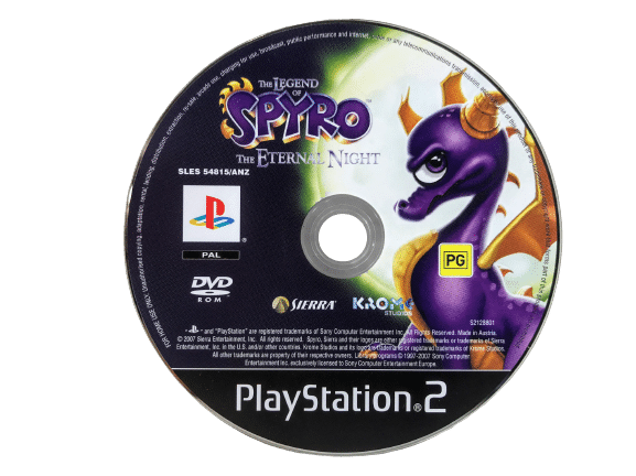 The Legend of SPYRO The Eternal Night for SONY PlayStation 2 / PS2. This preowned game disc is in good condition and comes inside an empty blank case. Please note that the original case is NOT included. Very fine scratches, but these are minor imperfections which do not hinder game play or performance in any way.