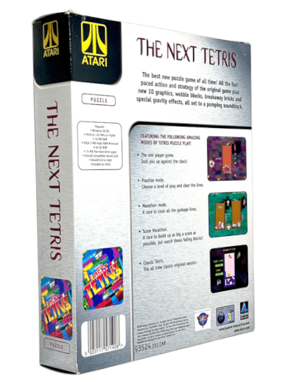 The Next Tetris (Atari PC) BIG BOX EDITION. This preowned game disc is in excellent condition and includes pictured case + contents. Case has some minor wear and tear. Please NOTE that as a preowned PC game, this game may require a new Steam code or key code purchased online in order to unlock the game. Refer photographs.
