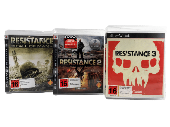 Excellent condition & 100% complete with contents: ALL THREE RESISTANCE GAMES for SONY PlayStation 3 / PS3. This triple pack includes each of Resistance 3, Resistance 2, and Resistance Fall of Man (the original Resistance game). Each game in excellent condition and complete with manual as pictured.