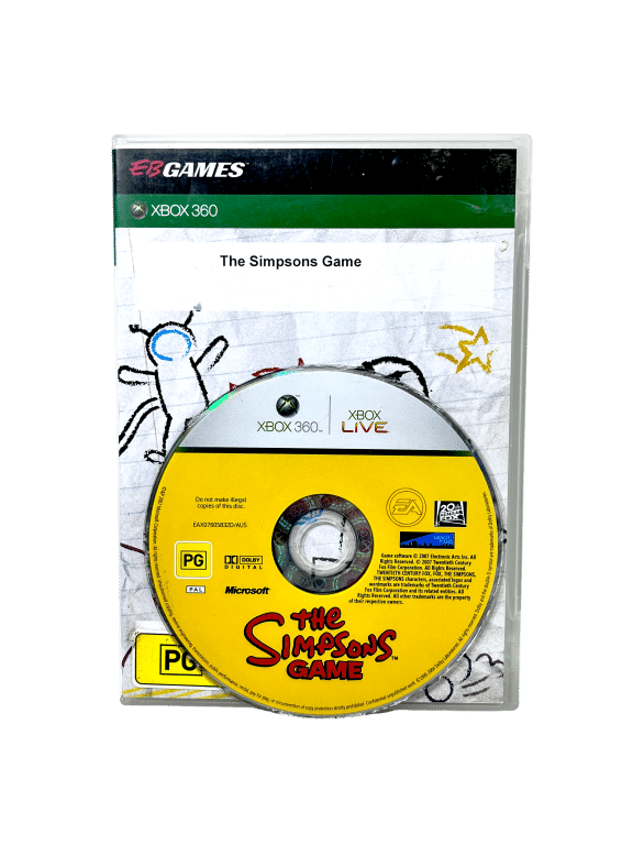The Simpsons Game (Xbox 360). This preowned game disc is in good condition with only light markings and superficial scratches which are purely cosmetic and do not affect gameplay or performance in any way. Game comes inside EB Games case (NOT original case).